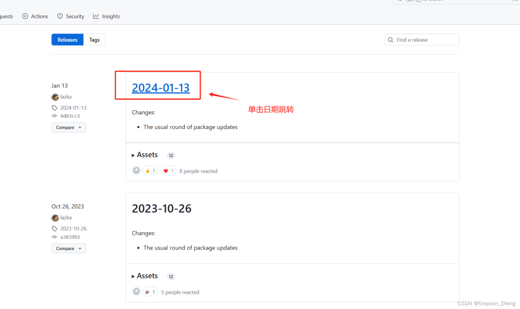 进入链接后,可以看到历史版本的更替,截至本教程编写日期,最新版本为 2024-01-13 的版本,单击日期跳转至下载窗口。