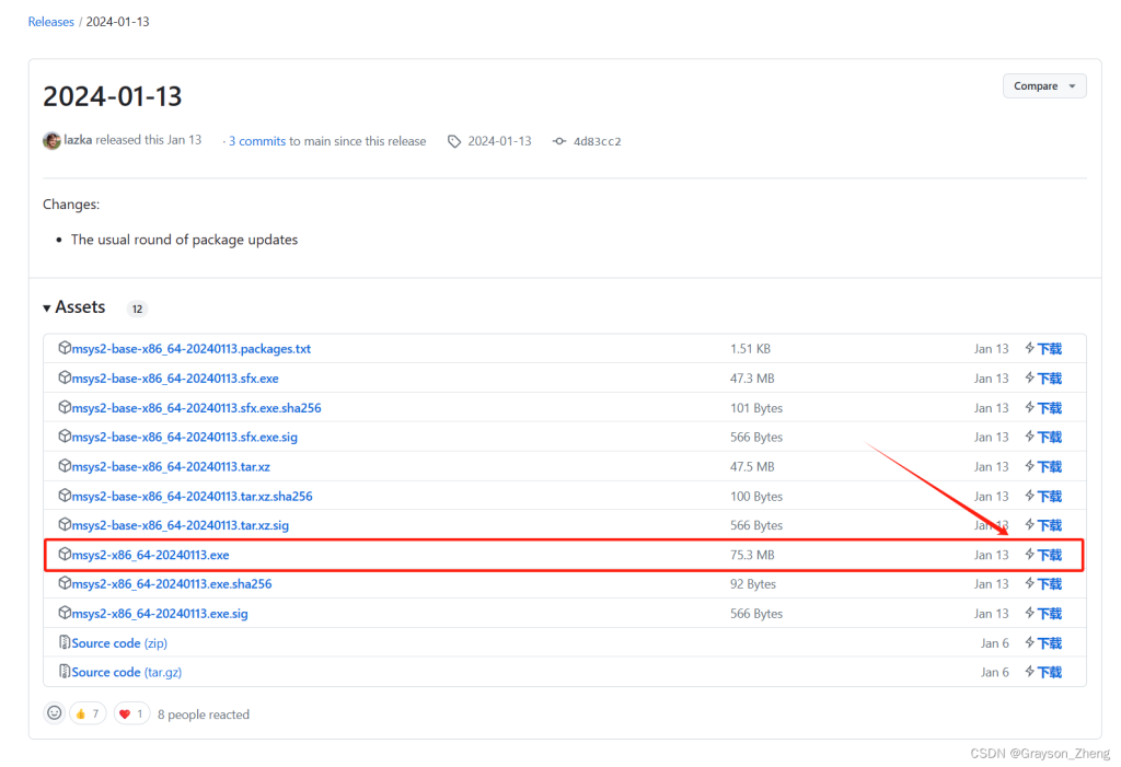 如下图所示,选择msys2-x86_64-20240113.exe(记住前缀是 msys2-x86_64 就行,后面是日期),点击后面的下载标志。