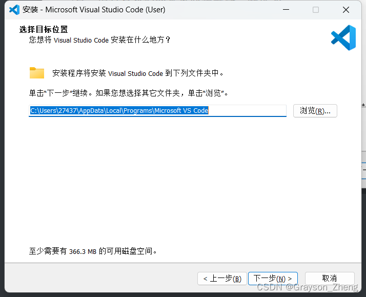 这里提示 VS Code 的安装位置,我只有一个 C 盘(现在的固态硬盘可以选择不分区),所以选择默认默认路径,直接点击下一步。当然,你的电脑硬盘要是有分区的话,可以选择其他路径。