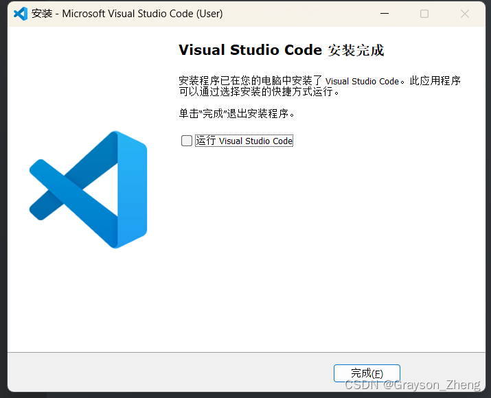 安装完成后,先暂时不运行 VS Code,把勾选去掉,点击完成