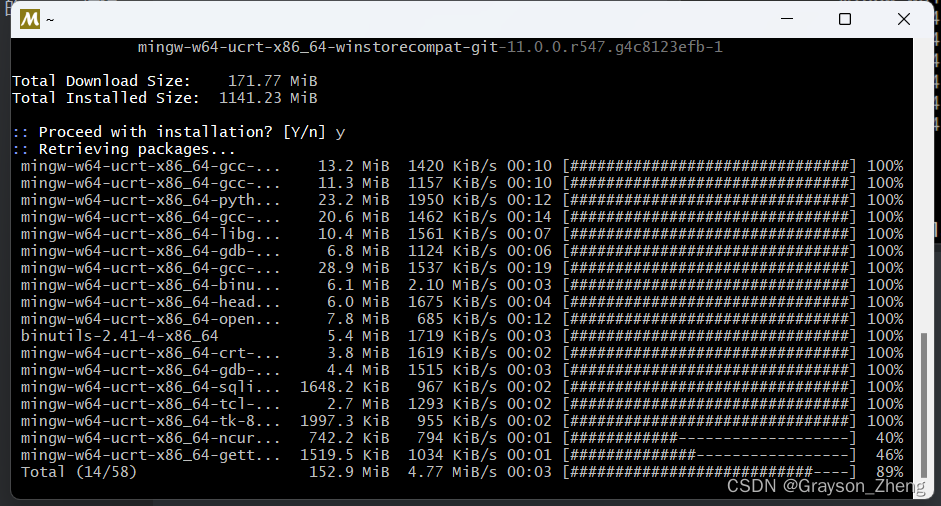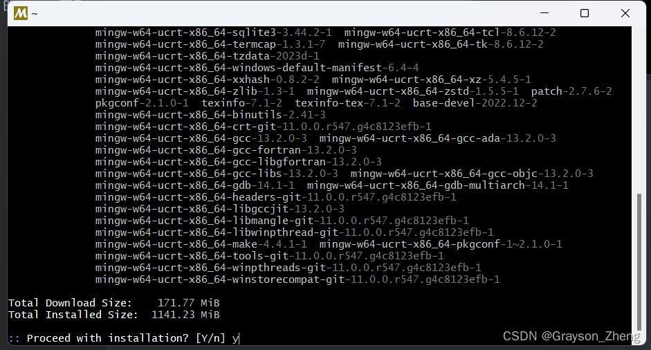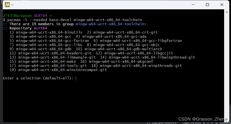 在此终端中,通过输入以下命令并按回车键,安装 MinGW-w64 工具链: