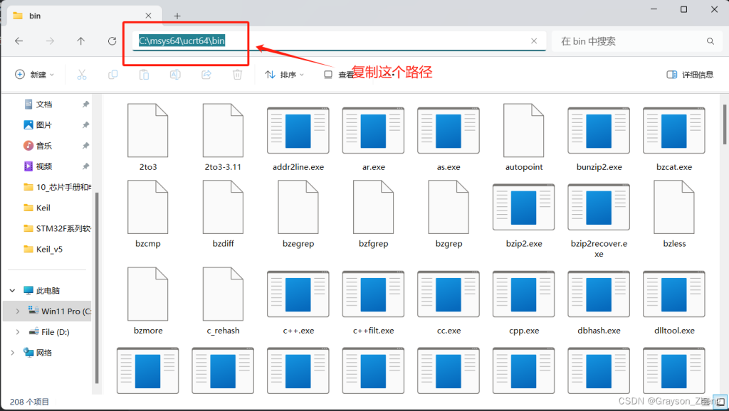 打开安装 MSYS2 的目录,先找到ucrt64文件夹并进入,再找到bin文件夹并进入,然后在地址栏中,复制路径。