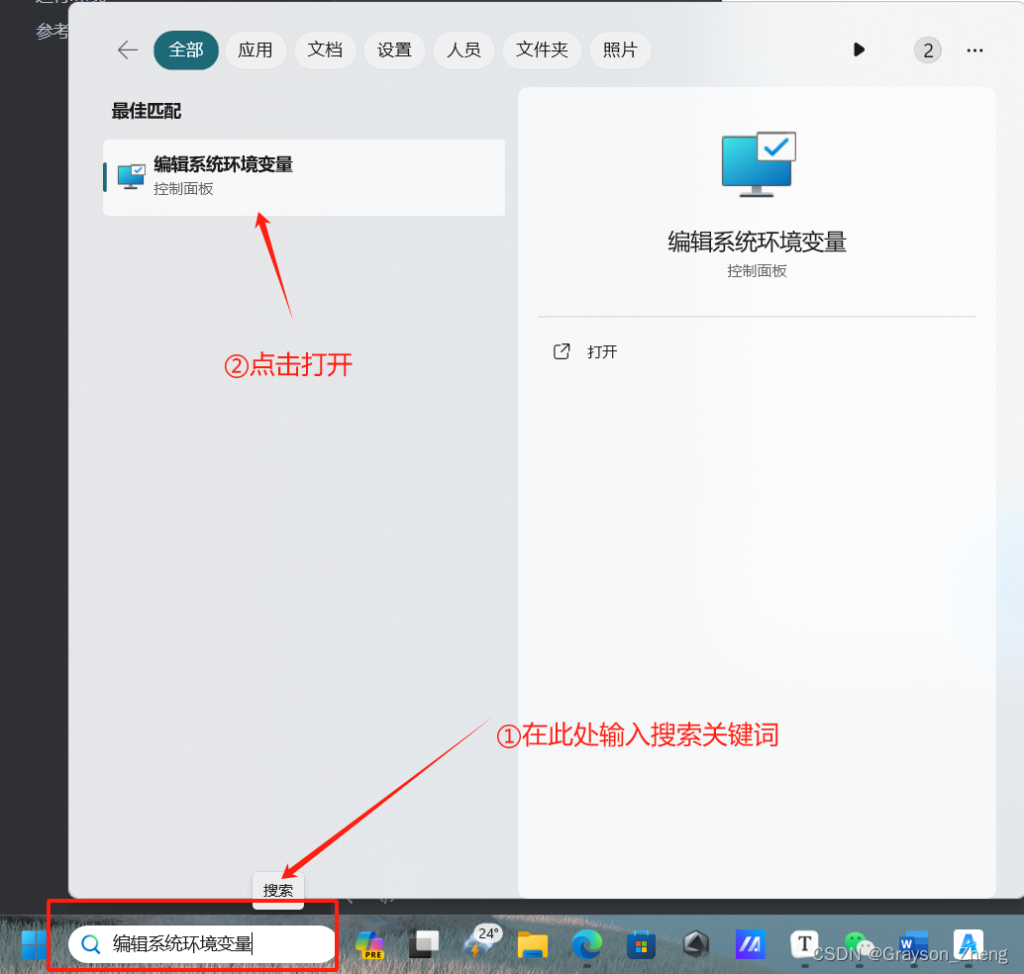 然后在搜索框中输入 编辑系统环境变量,并打开编辑系统环境变量的设置界面。
