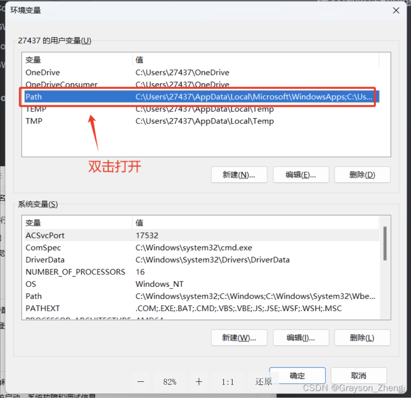 在弹出的环境变量弹窗中,找到用户变量的Path,并双击打开。