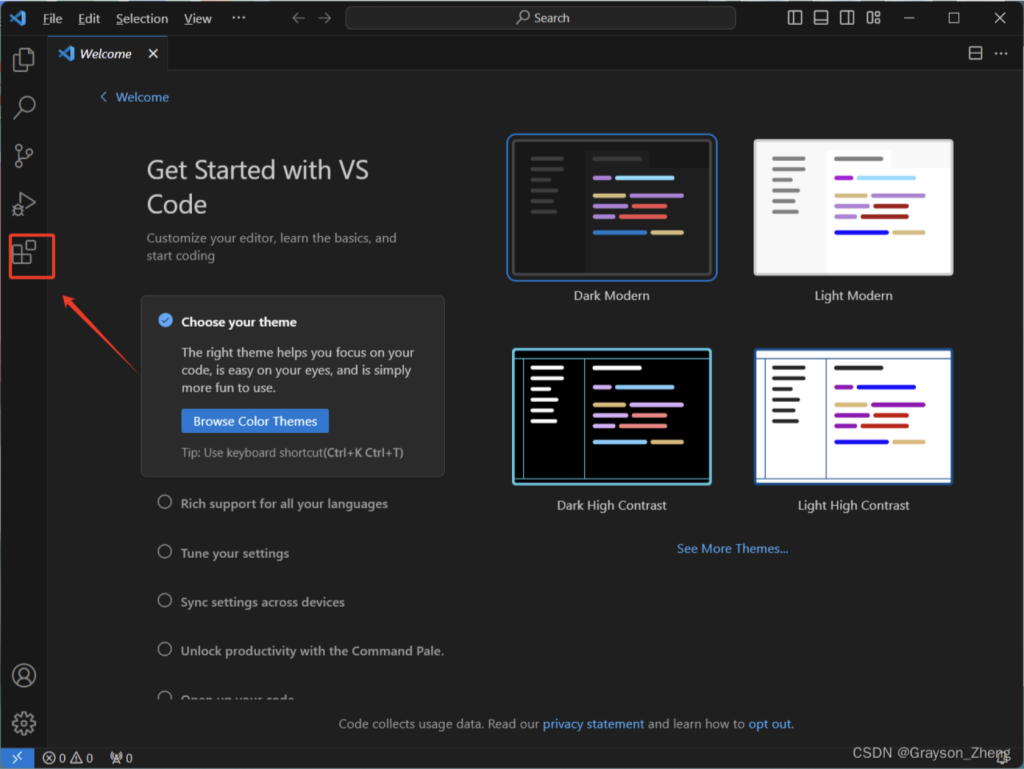 首先启动 VS Code 软件,按下组合键Ctrl + Shift + x,或者直接点击左边的第五个小图标,进入Extensions