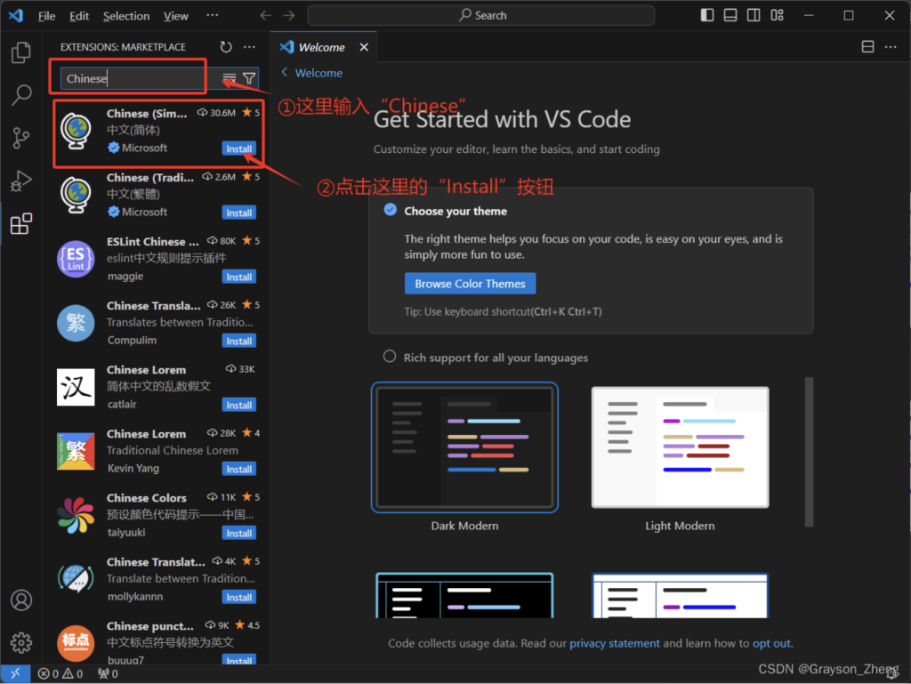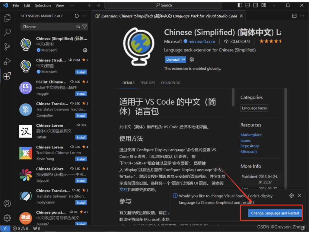 在上方输入框中键入Chinese,扩展插件的列表会刷新出汉化插件,点击对应的Install按钮进行安装。