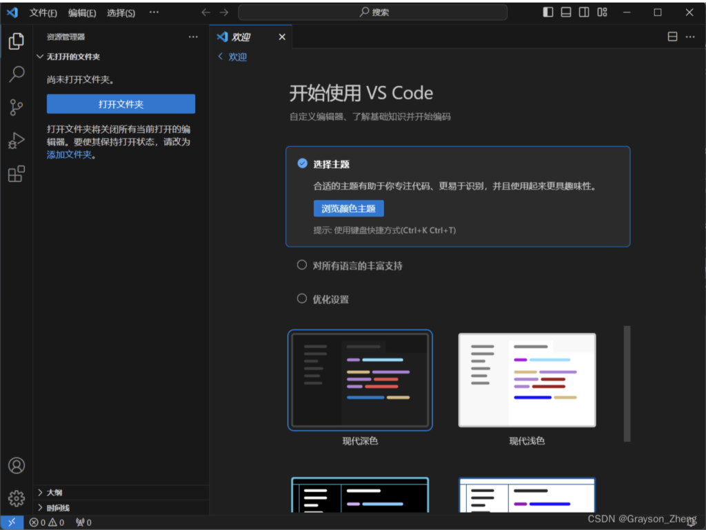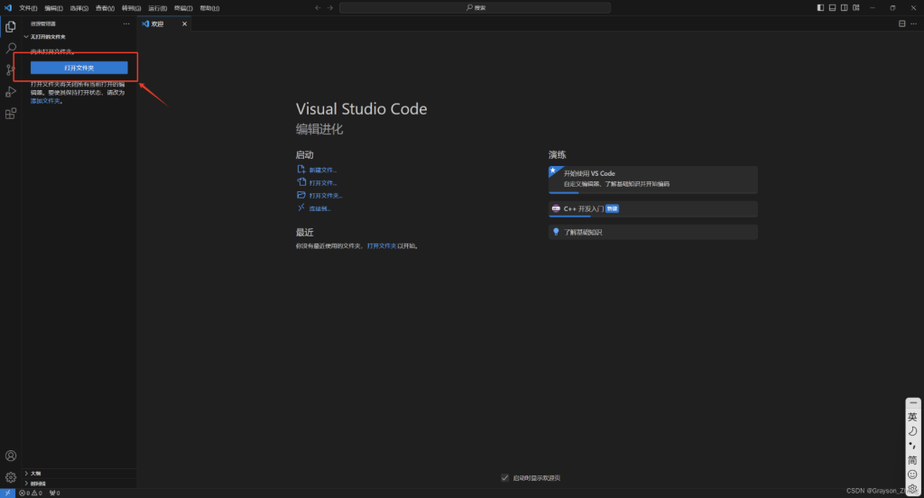 打开 VS Code,点击打开文件夹的按钮。