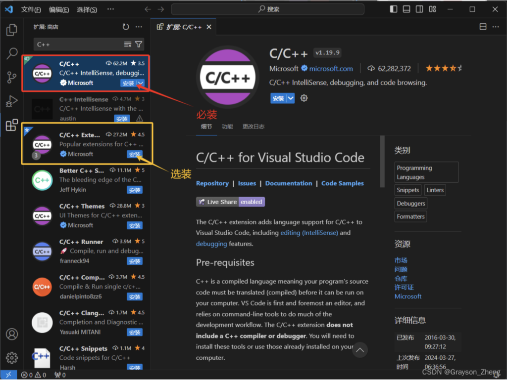 上图中的C/C++ Extension Pack是 C/C++ 的扩展功能包,里面包含了一些项目管理和代码构建的工具,不是必要的扩展包,可以选择性安装。