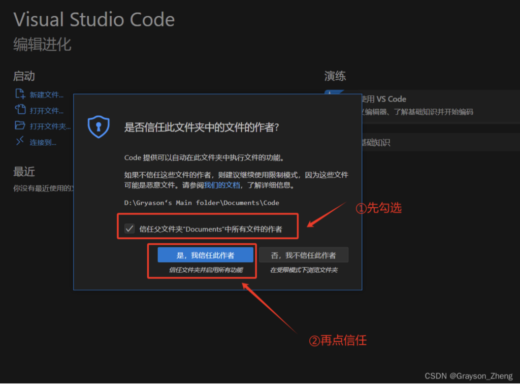 选中文件夹后,在新弹出的窗口中,勾选上信任父文件夹"Documents"中所有文件的作者,再点是,我信任此作者