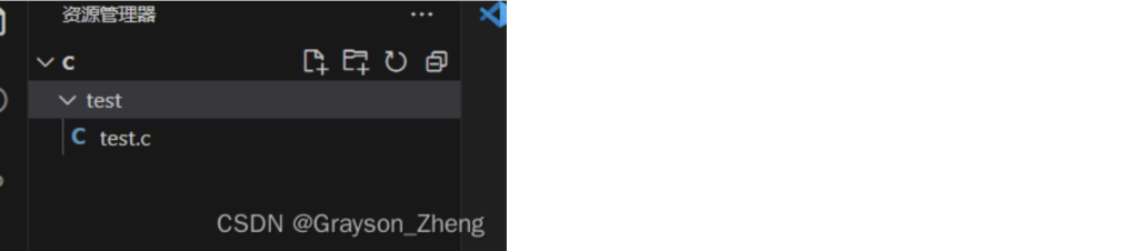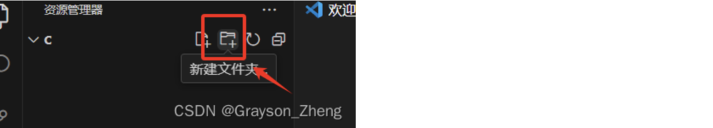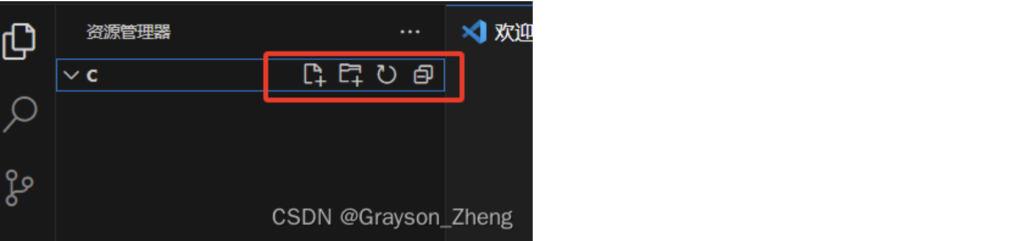 文件添加好后,在左边的资源管理器中会出现CODE文件夹以及子文件夹C,把鼠标放在文件夹上面,会出现四个小图标。四个小图标从左往右的作用分别是新建文件新建文件夹刷新资源管理器以及在资源管理器中折叠文件夹