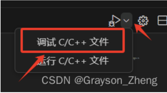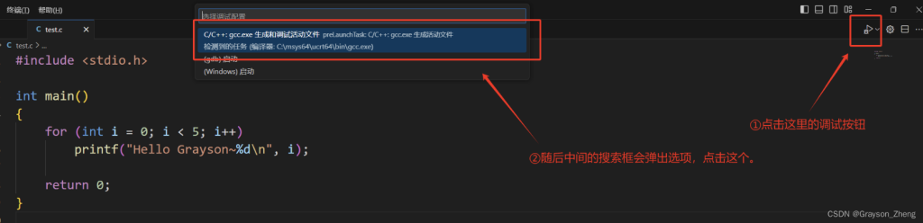 写好测试代码后,点击右上角的调试按钮,这时会弹出调试程序的选项,选择第一个,也是本教程前面安装的 gcc 编译工具。