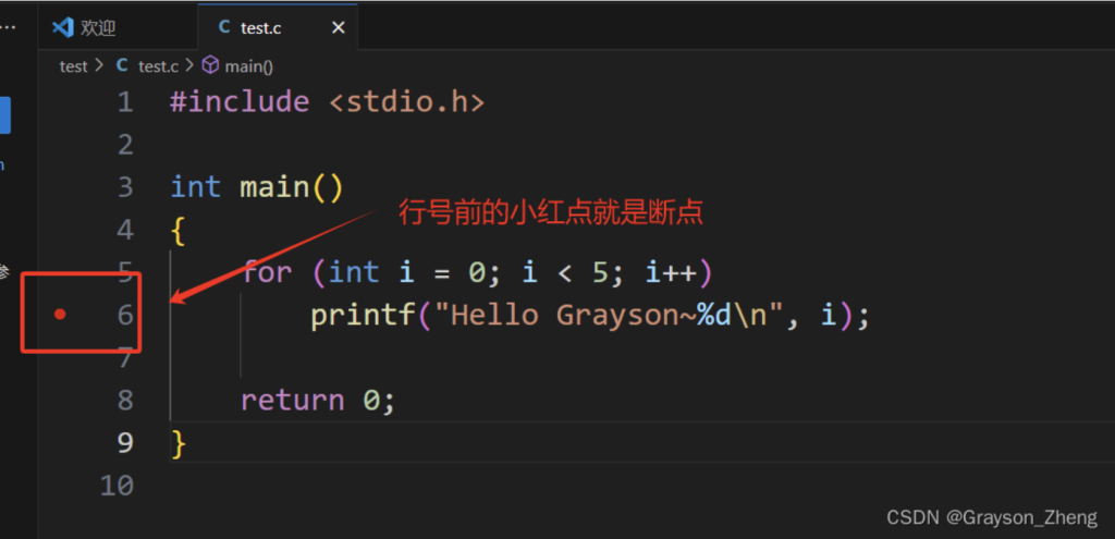 如果要进行简单的断点调试,可以在行号前加一个断点,操作也很简单,只需用鼠标左键点一下行号左边的空白处即可。如下图所示,是在第六行处加了一个断点。