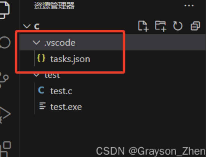 如果想要进行多个 .c 文件编译后的调试,就需要进行一些配置修改。如果进行过一次编译运行,我们会发现在资源管理器的C文件夹下,多出一个.vscode的文件夹,这个文件夹里面有个tasks.json的文件