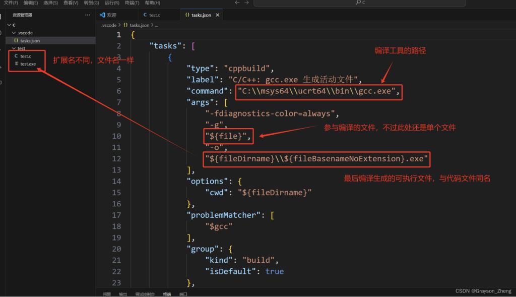 当前的 VS Code 的运行效果还不是很理想,双击打开tasks.json文件修改一下编译运行功能。下图是对该 JSON 文件做了部分解释。