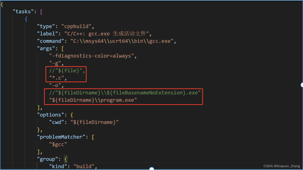 具体修改如下图所示,我注释掉了原来的"${file}",并新增一行"*.c",表示并非指定某一个 .c 文件,而是当前文件夹下所有的 .c 文件。同时也把"${fileDirname}\\${fileBasenameNoExtension}.exe"注释掉,改成"${fileDirname}\\program.exe",那么多个 .c 文件编译之后的可执行文件就是program.exe