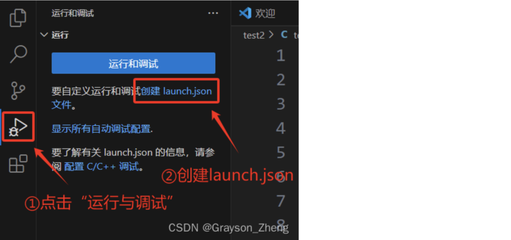 然后点击左侧的运行与调试,再点击创建launch.json文件