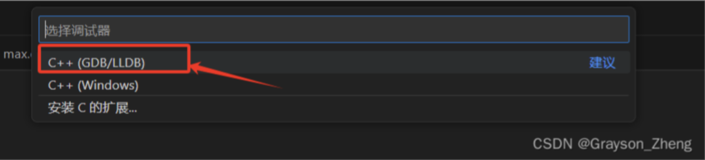 搜索框会弹出选项,选择C++(GDB/LLDB)