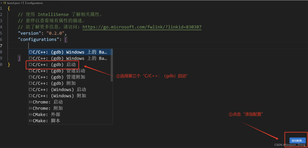 然后 VS Code 会新建一个 JSON 文件,点击右下角的添加配置,在弹出的下拉菜单中选择C/C++:(gdb)启动