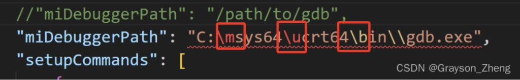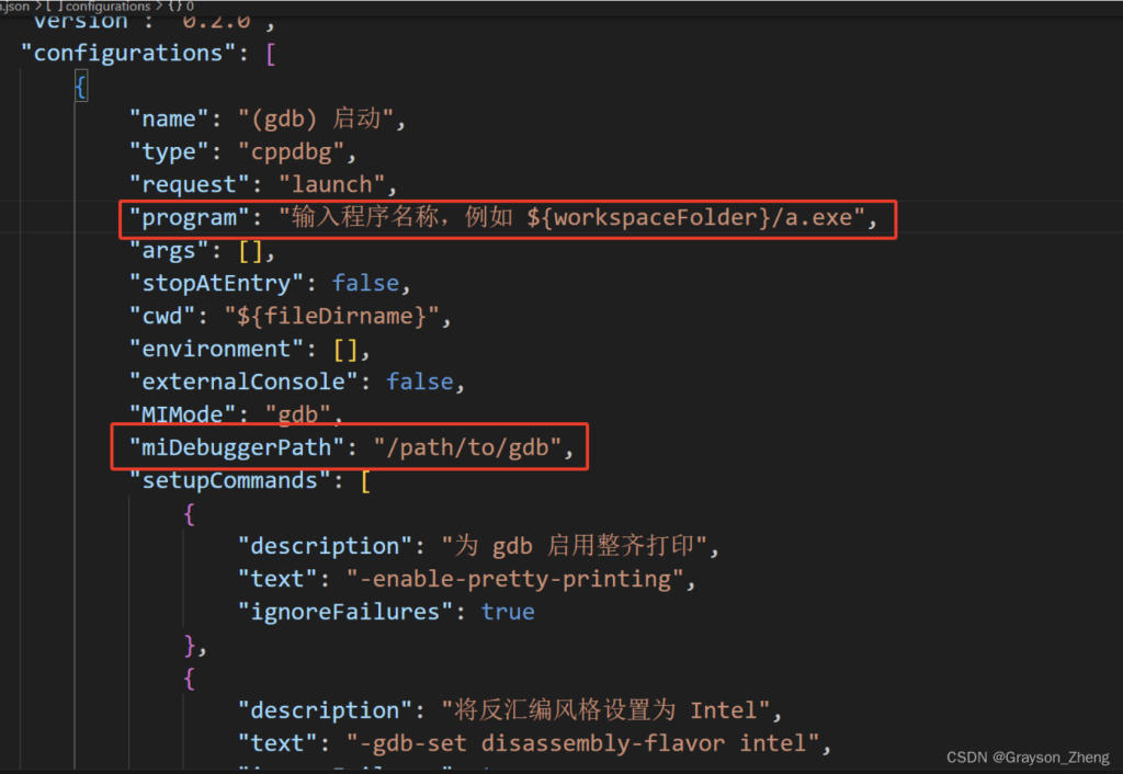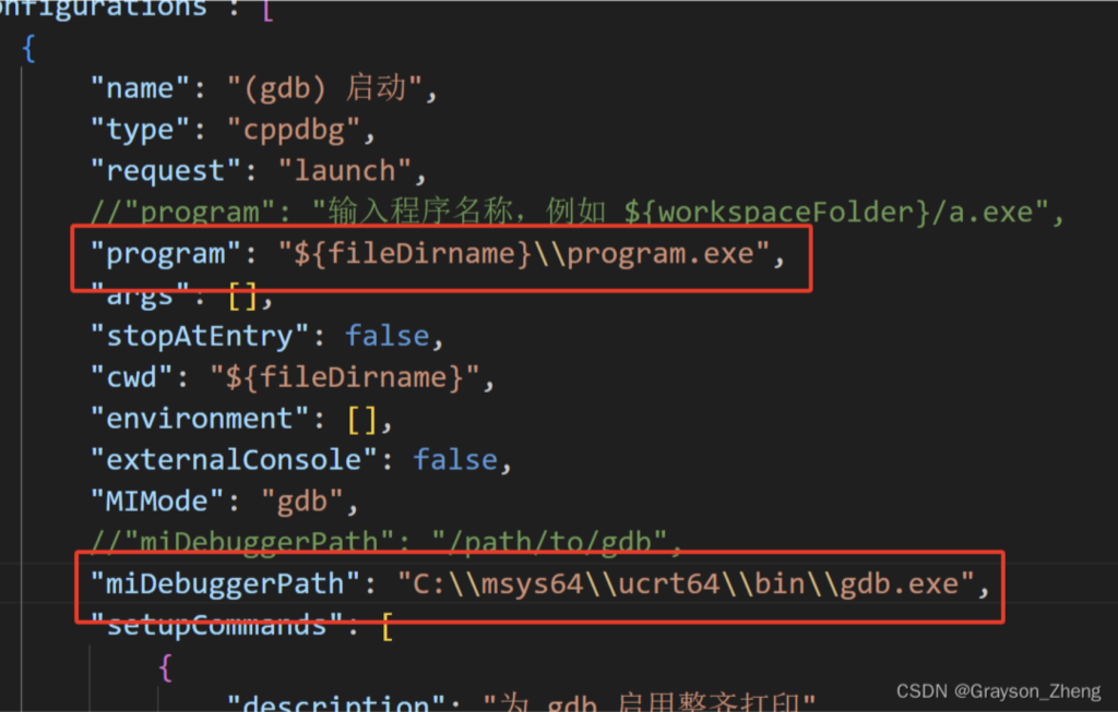 修改为下图红框所示内容,“program”后的内容就是前面提到的tasks.json文件中的编译后产生的可执行文件。"miDebuggerPath"后面的则是前面安装的 MinGW-W64 的 gdb 工具的路径。修改后保持关闭。