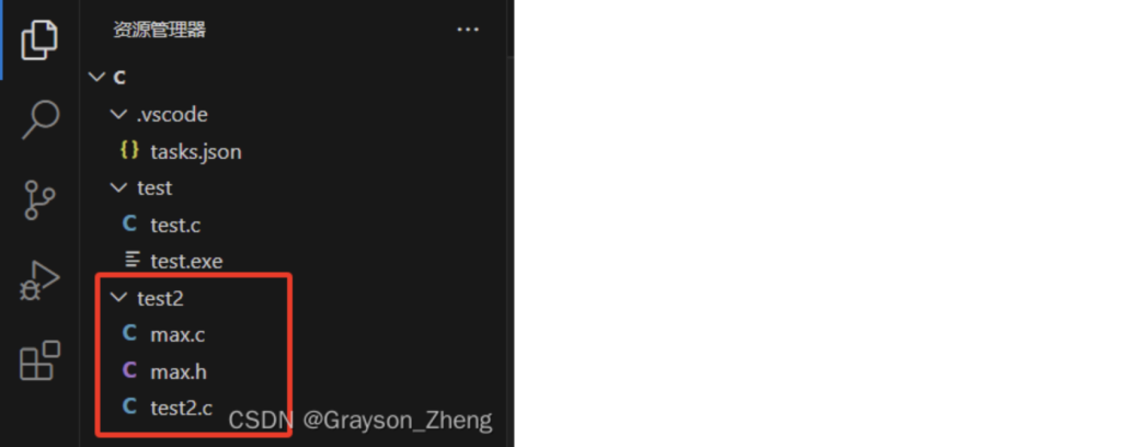 之后,我们进行多文件的编译调试,先在C文件夹下新建一个新的文件夹,我这里命名为test2,并在这个文件夹里面新建三个文件,分别是test.cmax.hmax.c