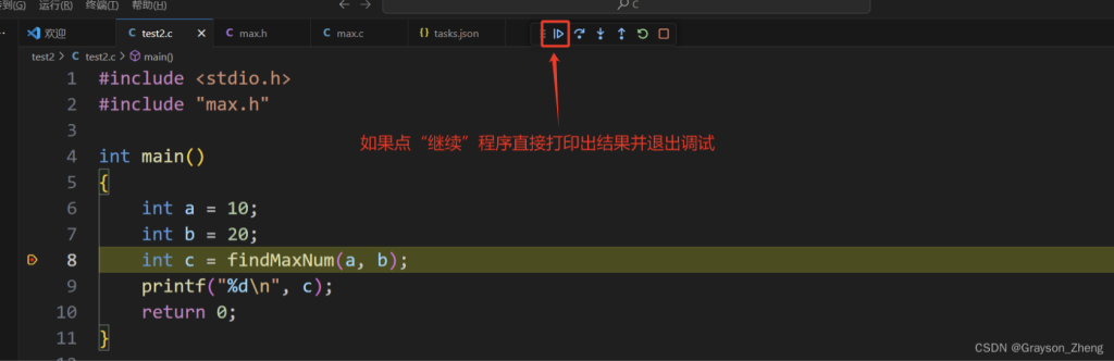 代码写好后,给test2.c的第 8 行代码打一个断点,再点调试按钮旁边的小三角形,在下拉菜单中选择调试C/C++文件
