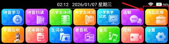 1. 启动点读笔,进入主桌面后,滑动屏幕找到「精品应用」页面;