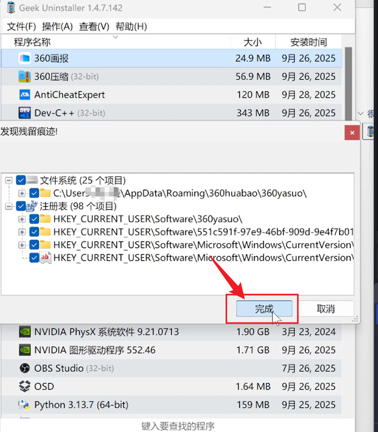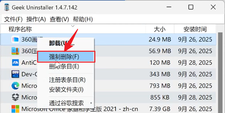 如果遇到软件卡死、无法正常卸载的情况,右键点击该软件,选择 “强制删除”,Geek 会强制终止相关进程并卸载,结束后同样会扫描残留,点击 “确定” 就能彻底清理,再也不用手动找残留文件。