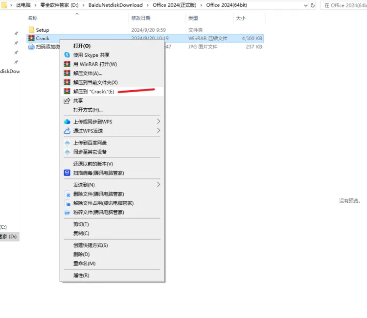 6.打开解压后的【Office 2024(64bit)】文件夹, ①鼠标右击【Crack】压缩包②选择电脑上安装的解压软件 ③点击【解压到Crack】。