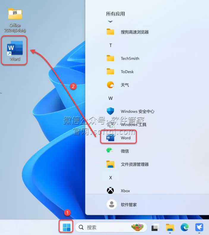 10.创建桌面快捷方式:(如:Word) ①点击桌面任务栏中的【开始图标】>点击【所有应用】> ②将【Word】图标拖到电脑桌面(可用同样的方法将“Excel、PPT”等产品创建桌面快捷方式)。