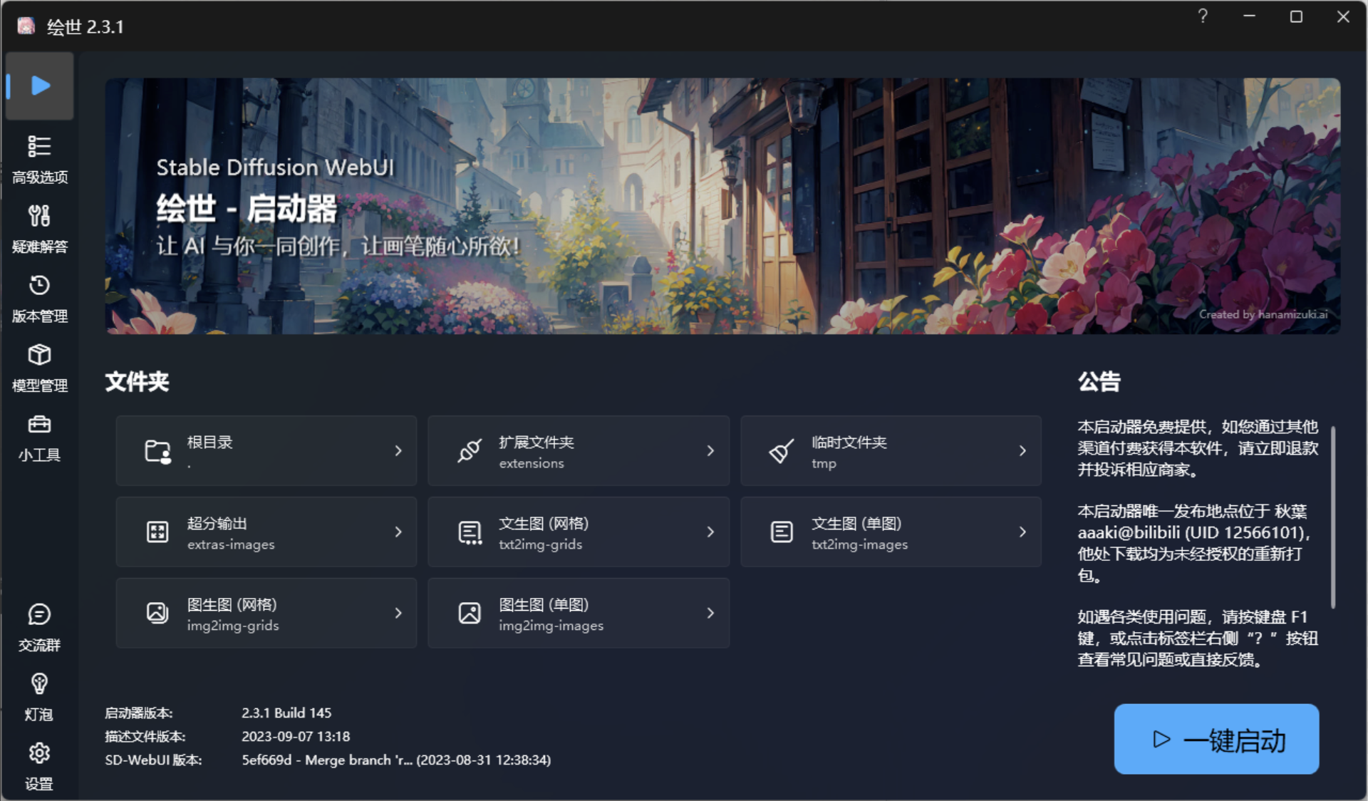- 建议硬盘剩余容量≥100GB,强烈建议安装到固态硬盘,否则加载/切换模型会非常慢甚至失败